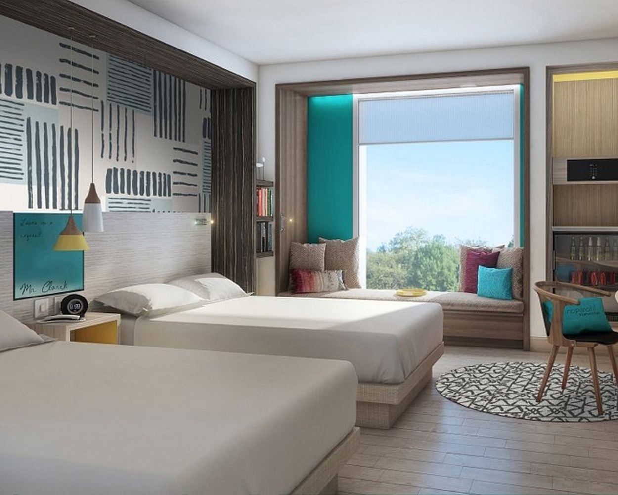 Room amenities: flat-screen TV, A/C, coffee maker, minifridge, and in-room safe.